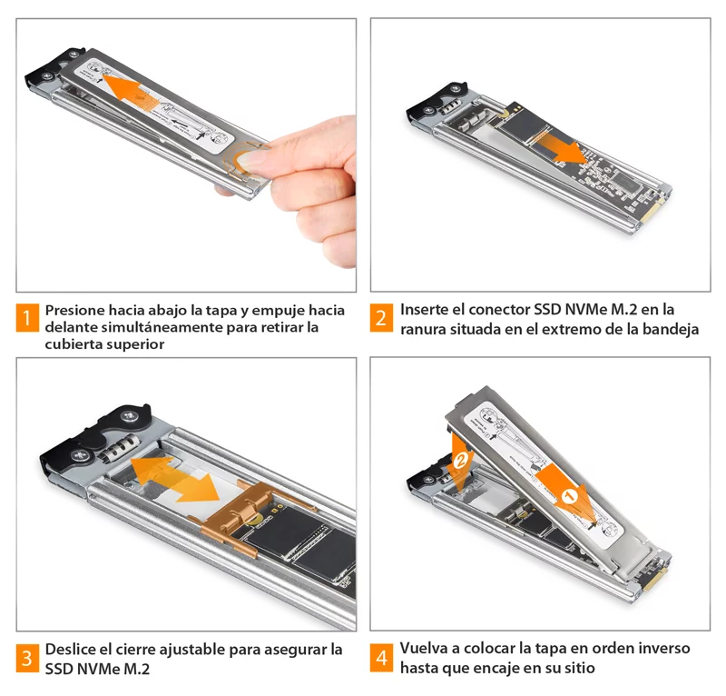 P: Tengo dificultades para cerrar la tapa de la bandeja de la unidad y no puedo insertar la bandeja de la unidad hasta el final de la carcasa de la unidad después de colocar el SSD M.2 en la bandeja de la unidad.
