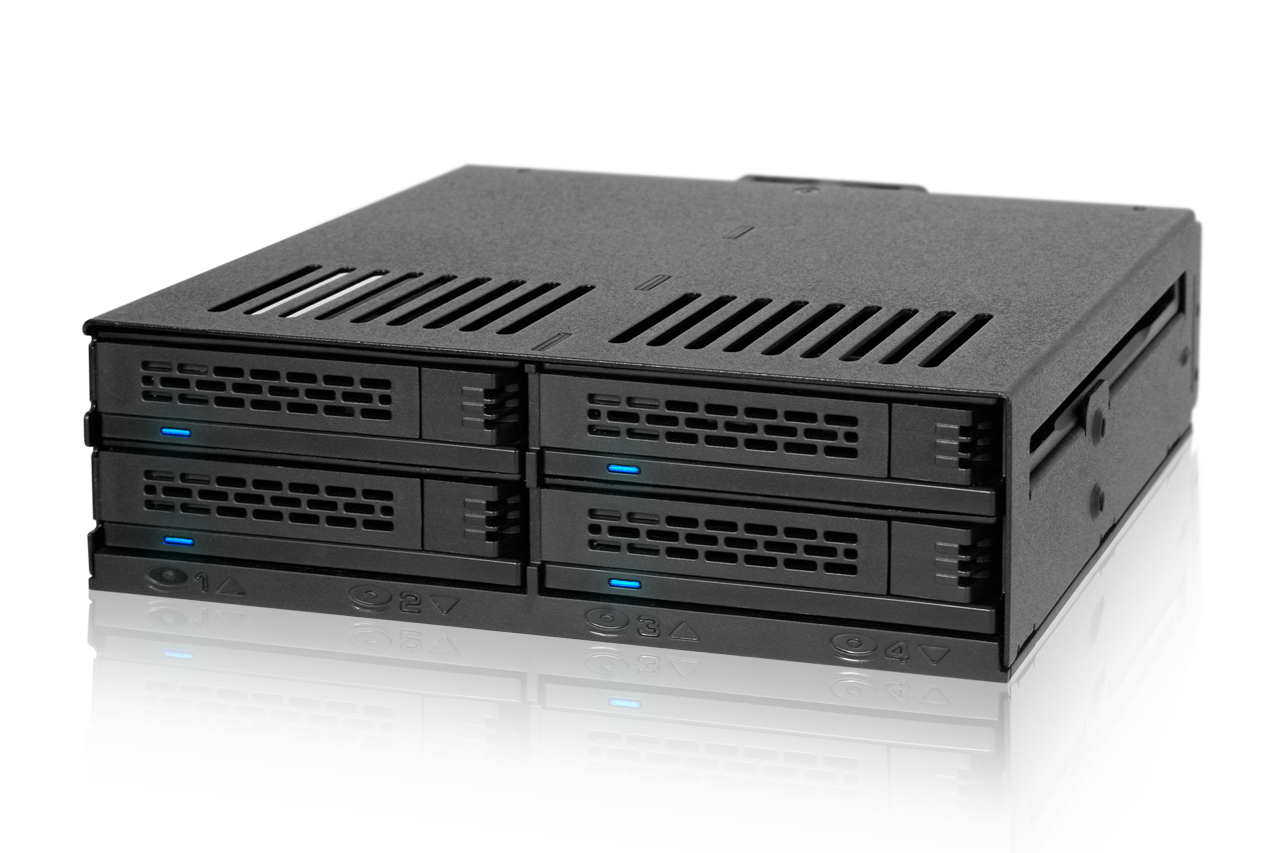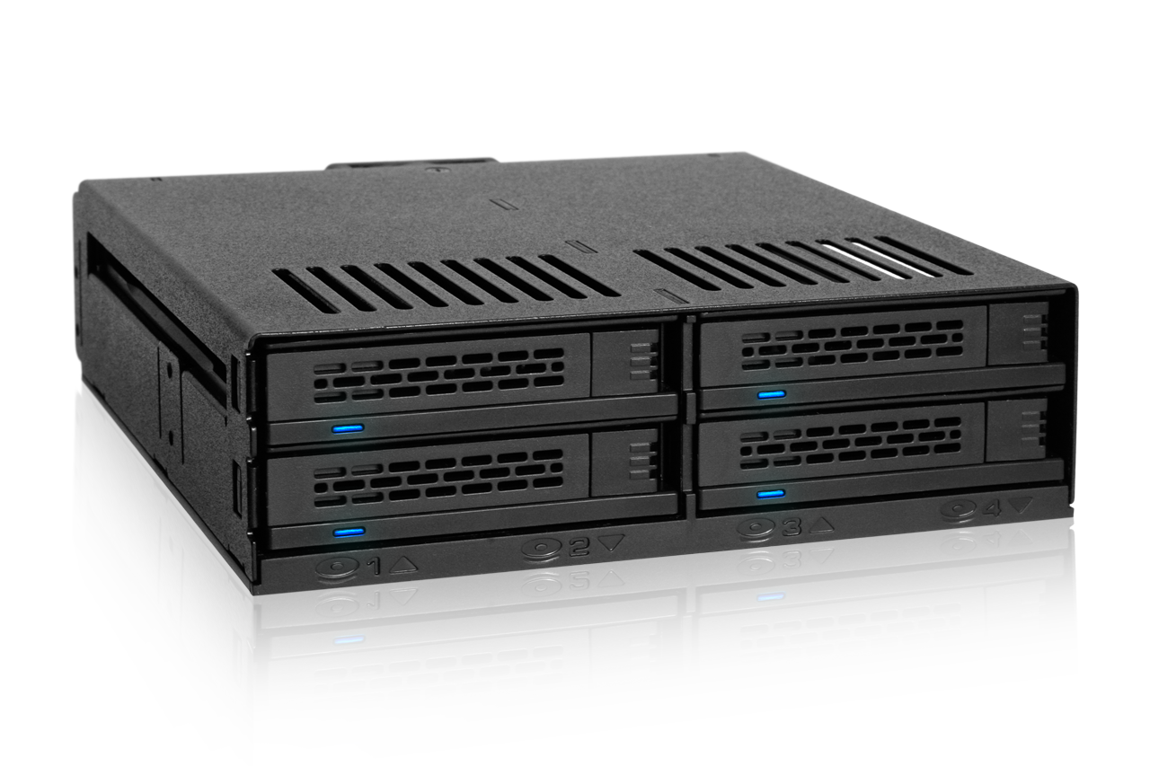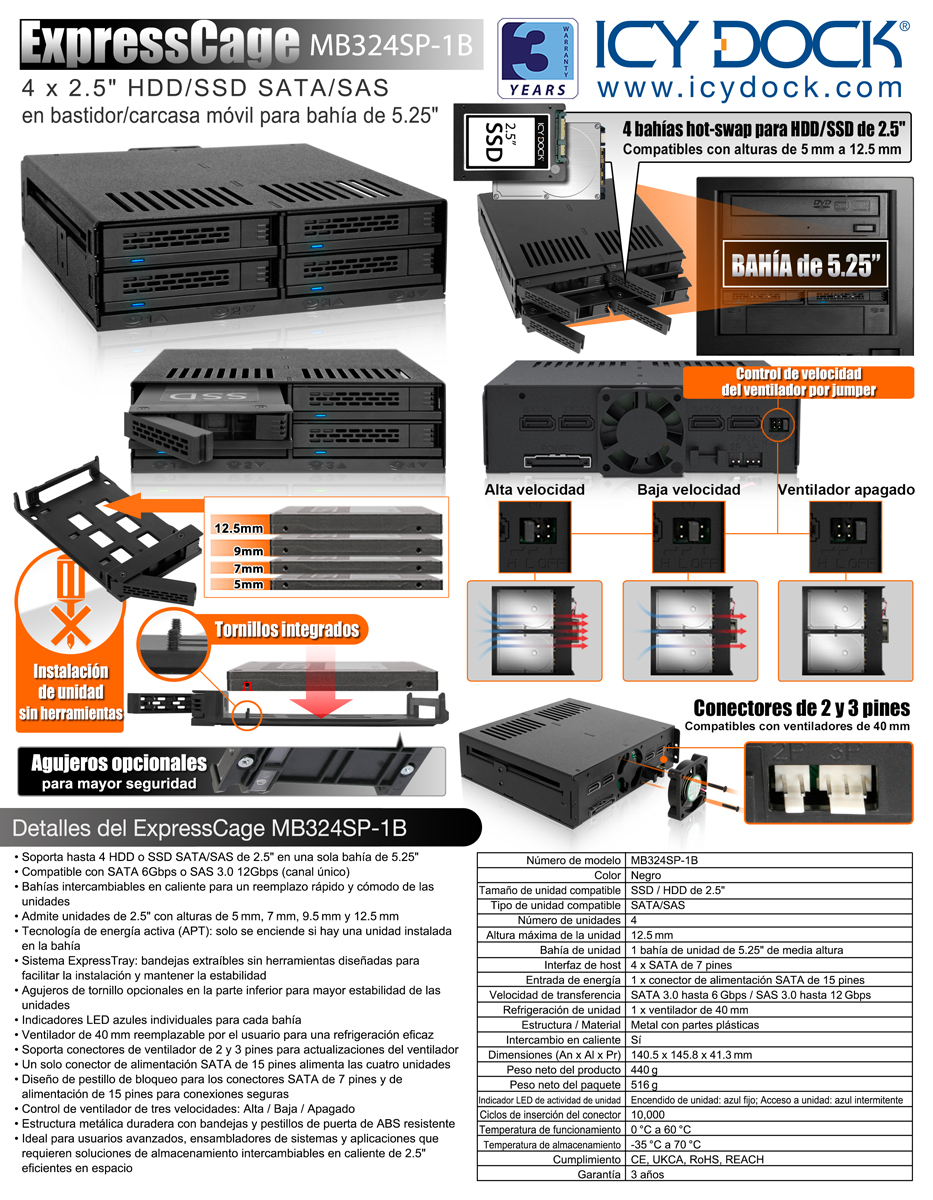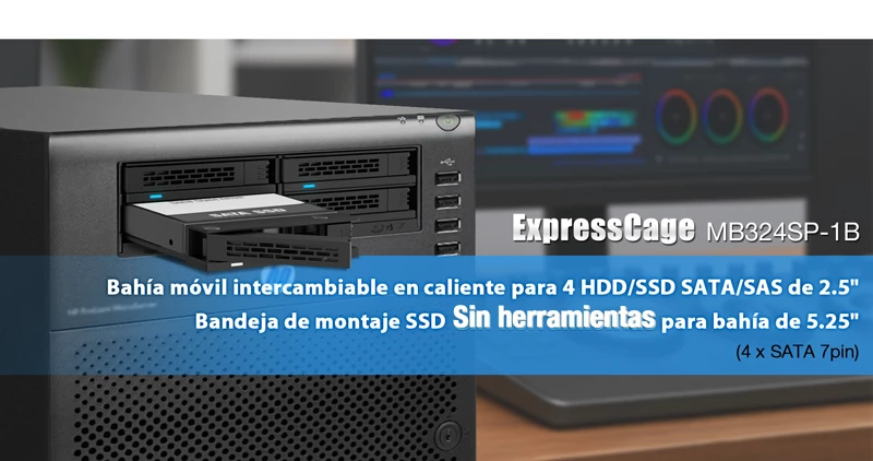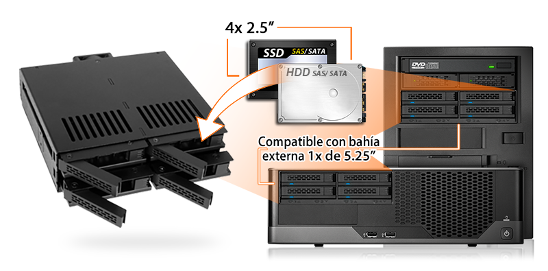 | • | Admite hasta 4 x 2.5" HDD o SSD SATA/SAS en una sola bahía de 5.25" |