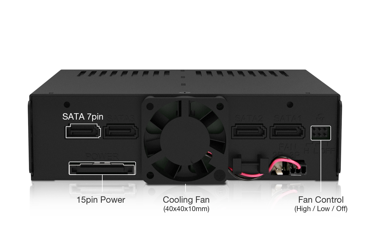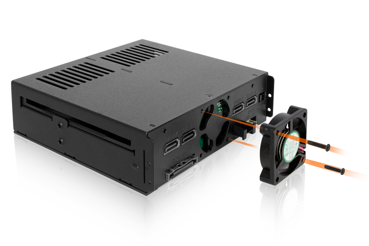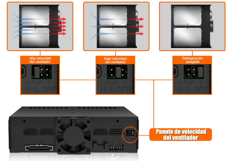 Un ventilador de refrigeración de 40 mm montado en la parte trasera proporciona un flujo de aire directo a través de las cuatro unidades, respaldado por orificios de ventilación alrededor del chasis y las bandejas. Los usuarios pueden seleccionar entre tres modos de ventilador usando un puente (jumper):