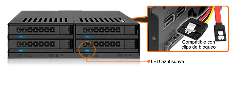 | • | Un solo conector de energía SATA de 15 pines alimenta las cuatro unidades |