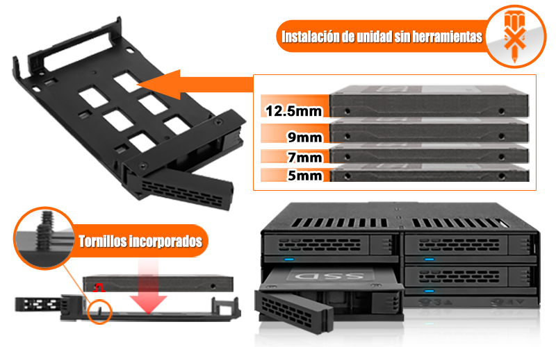 | • | Ideal para usuarios avanzados, ensambladores de sistemas y aplicaciones que requieren soluciones de almacenamiento intercambiables en caliente de 2.5" que ahorran espacio |