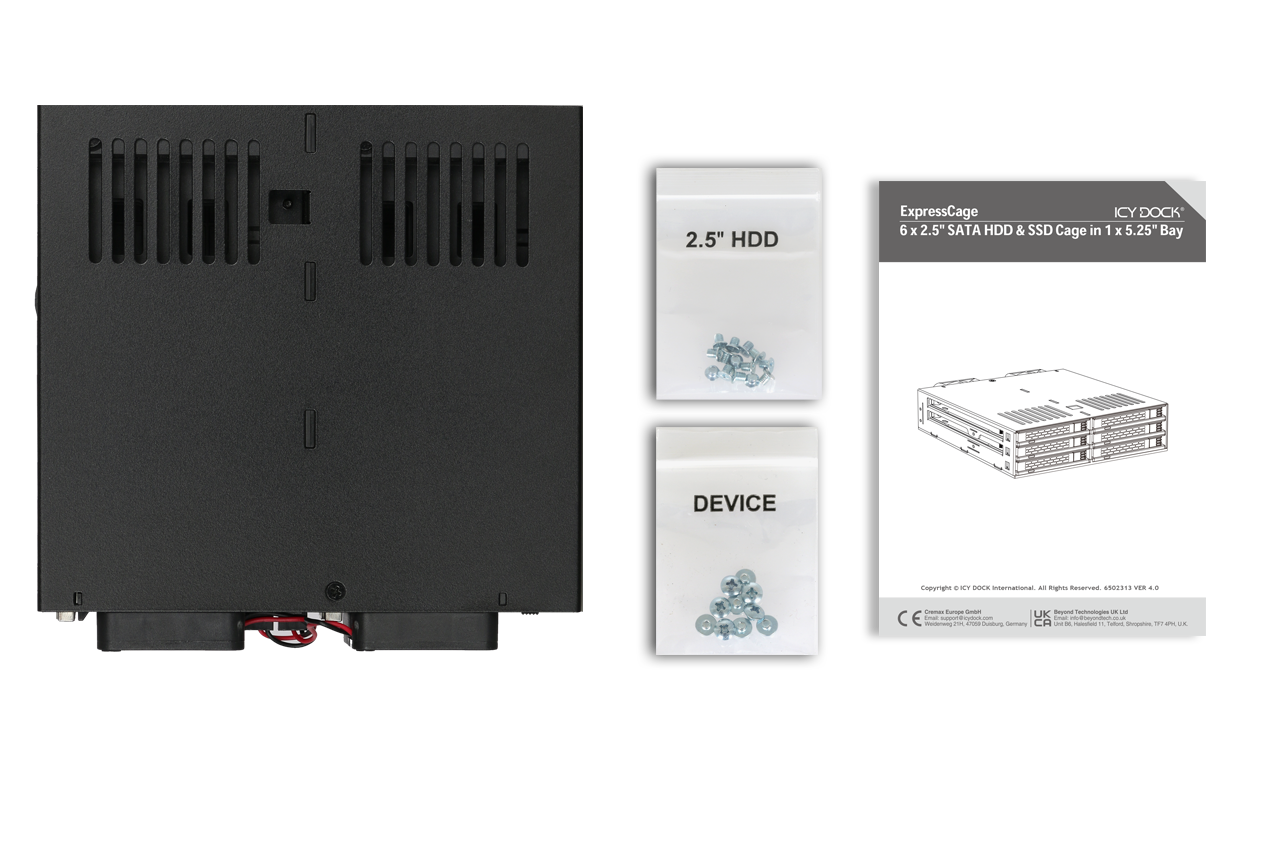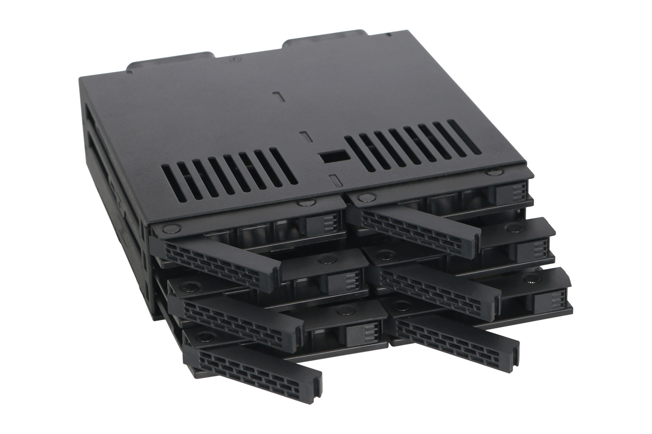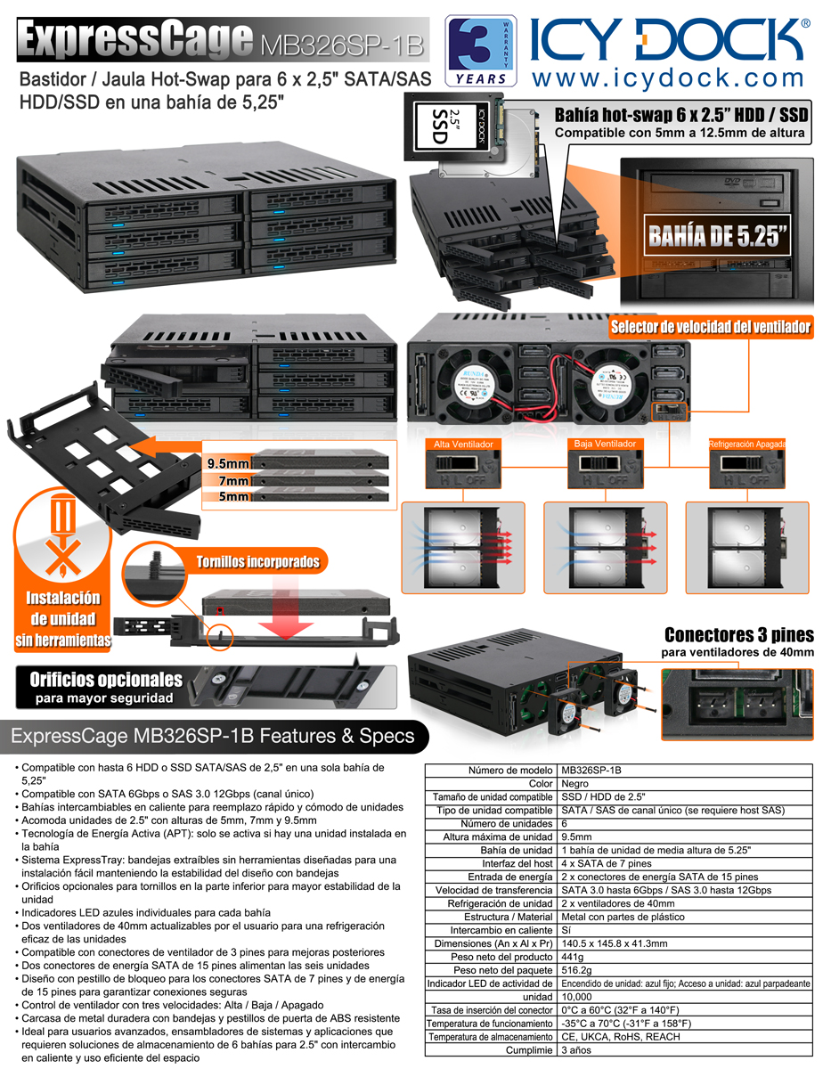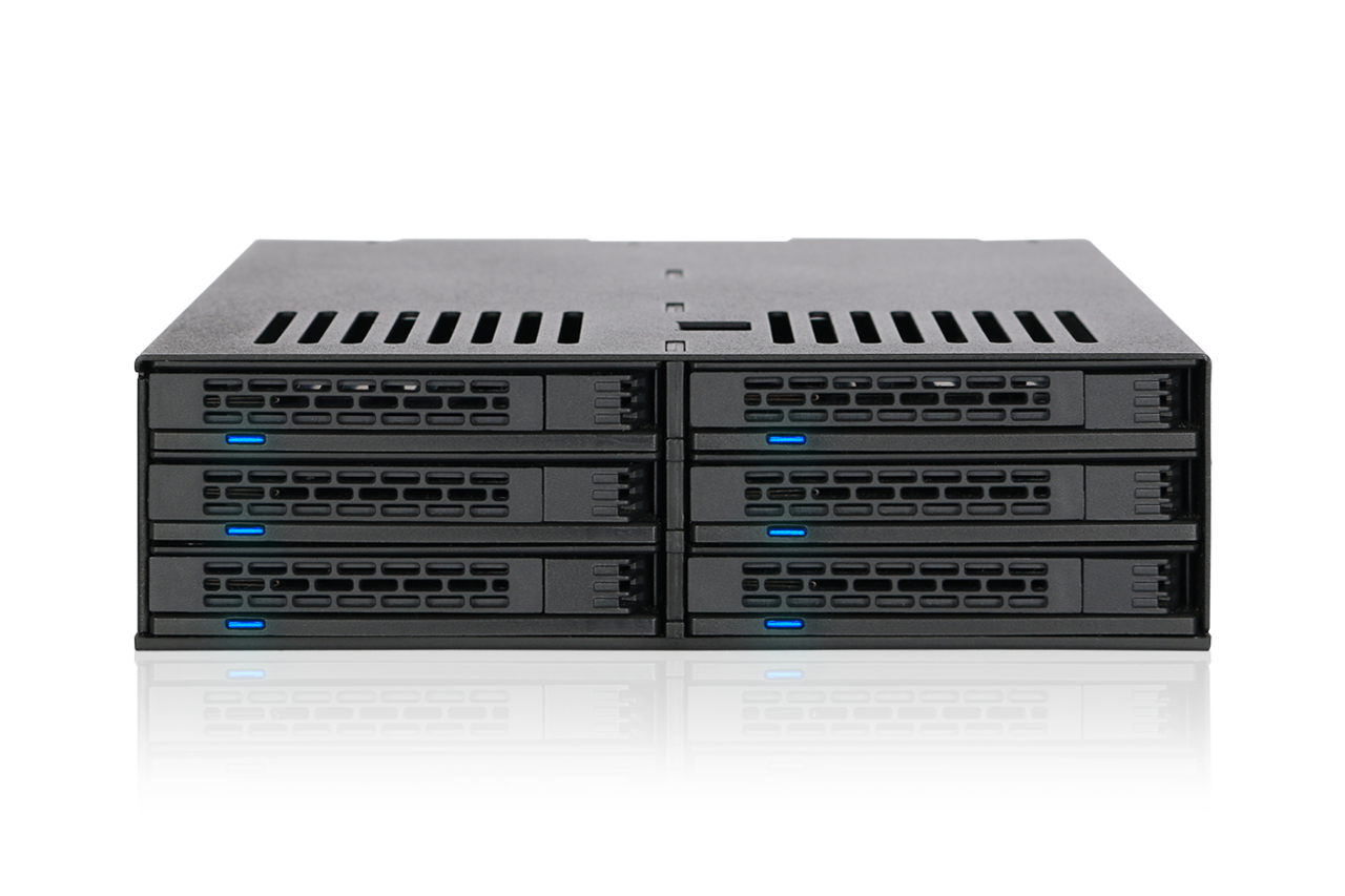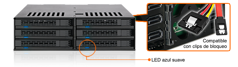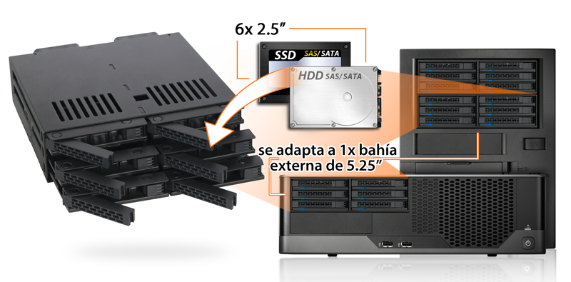 | • | Compatible con hasta 6 HDD o SSD SATA/SAS de 2,5" en una sola bahía de 5,25" |