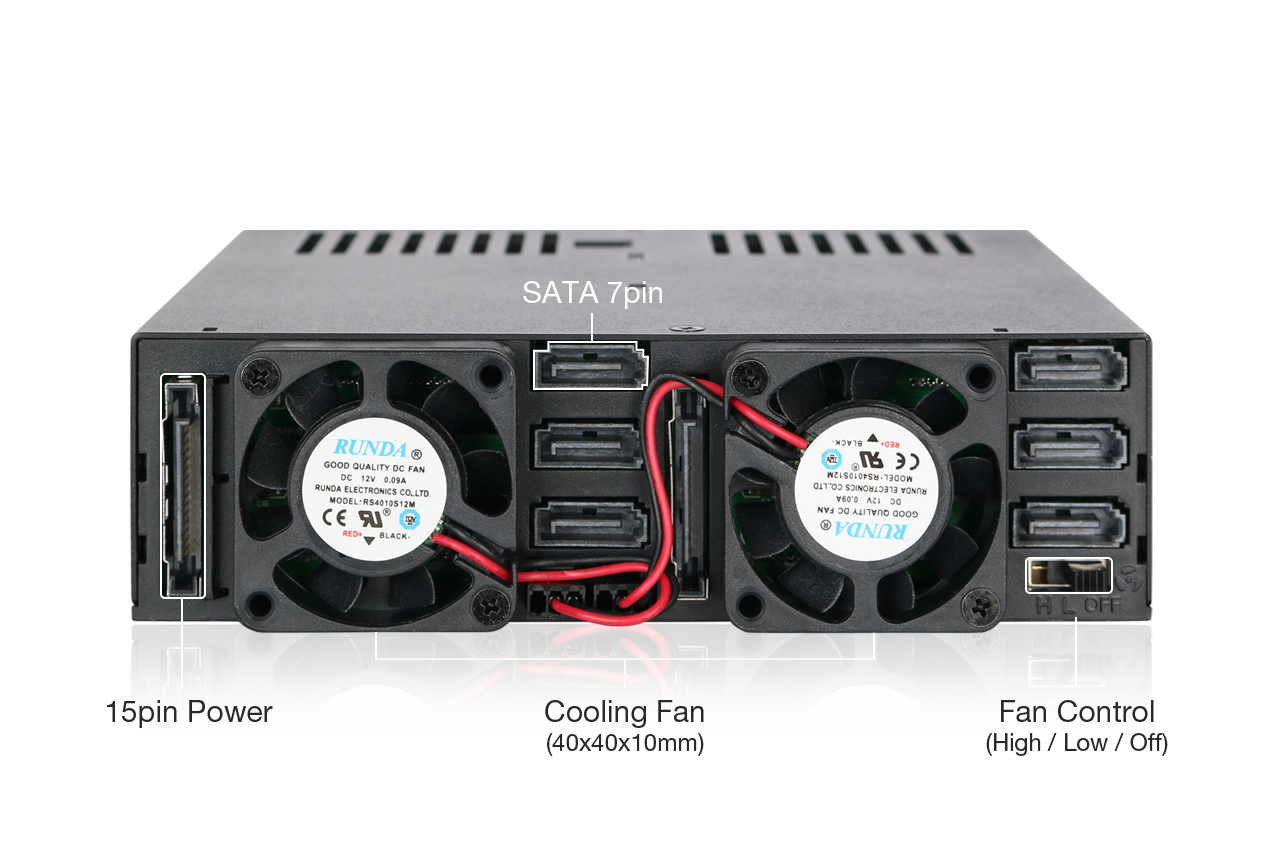 Para manejar las demandas térmicas de seis unidades, el MB326SP-1B está equipado con dos ventiladores de refrigeración de 40 mm montados en la parte trasera, respaldados por orificios de ventilación alrededor del chasis y las bandejas. Los usuarios pueden seleccionar entre tres modos de ventilador utilizando un interruptor deslizante: