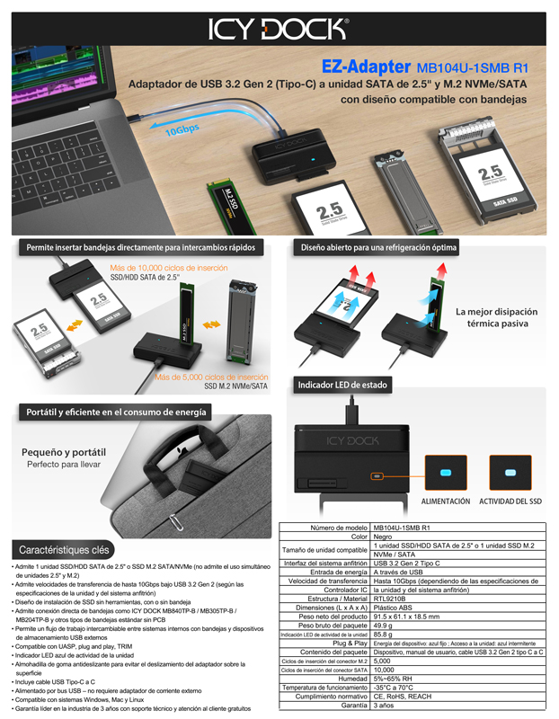 | Compatible con | • 2.5" SATA SSD/HDD • Bandejas 2.5" SATA SSD/HDD • 2.5" SATA SSD/HDD |