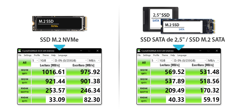 • 2.5" SATA SSD/HDD • Bandejas 2.5" SATA SSD/HDD • 2.5" SATA SSD/HDD • Bandejas M.2 NVMe/SATA SSD |