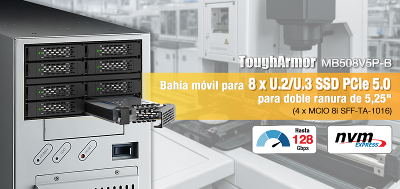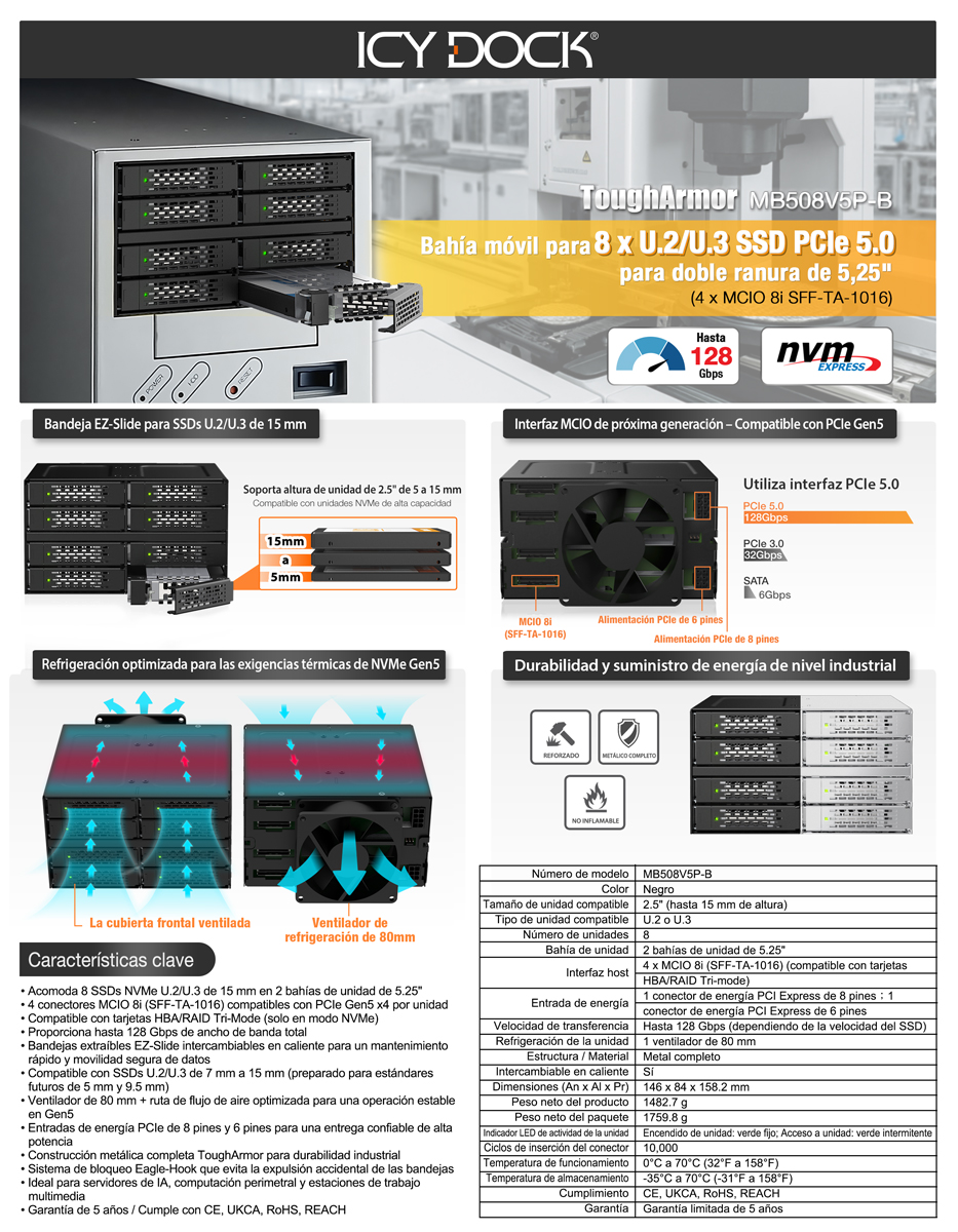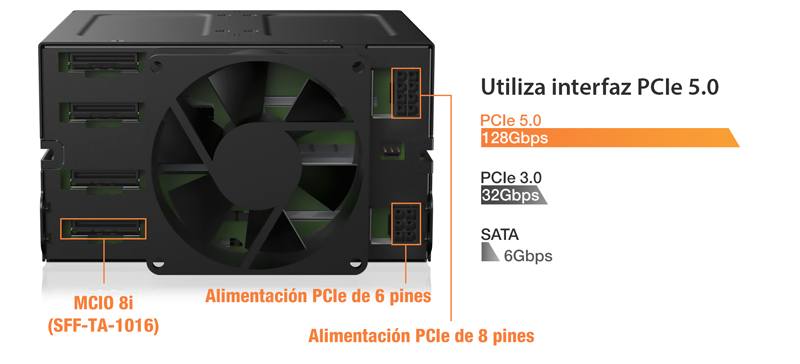 | Interfaz del host: | 4 x MCIO 8i (SFF-TA-1016) (compatible con tarjeta HBA/RAID Tri-mode) |