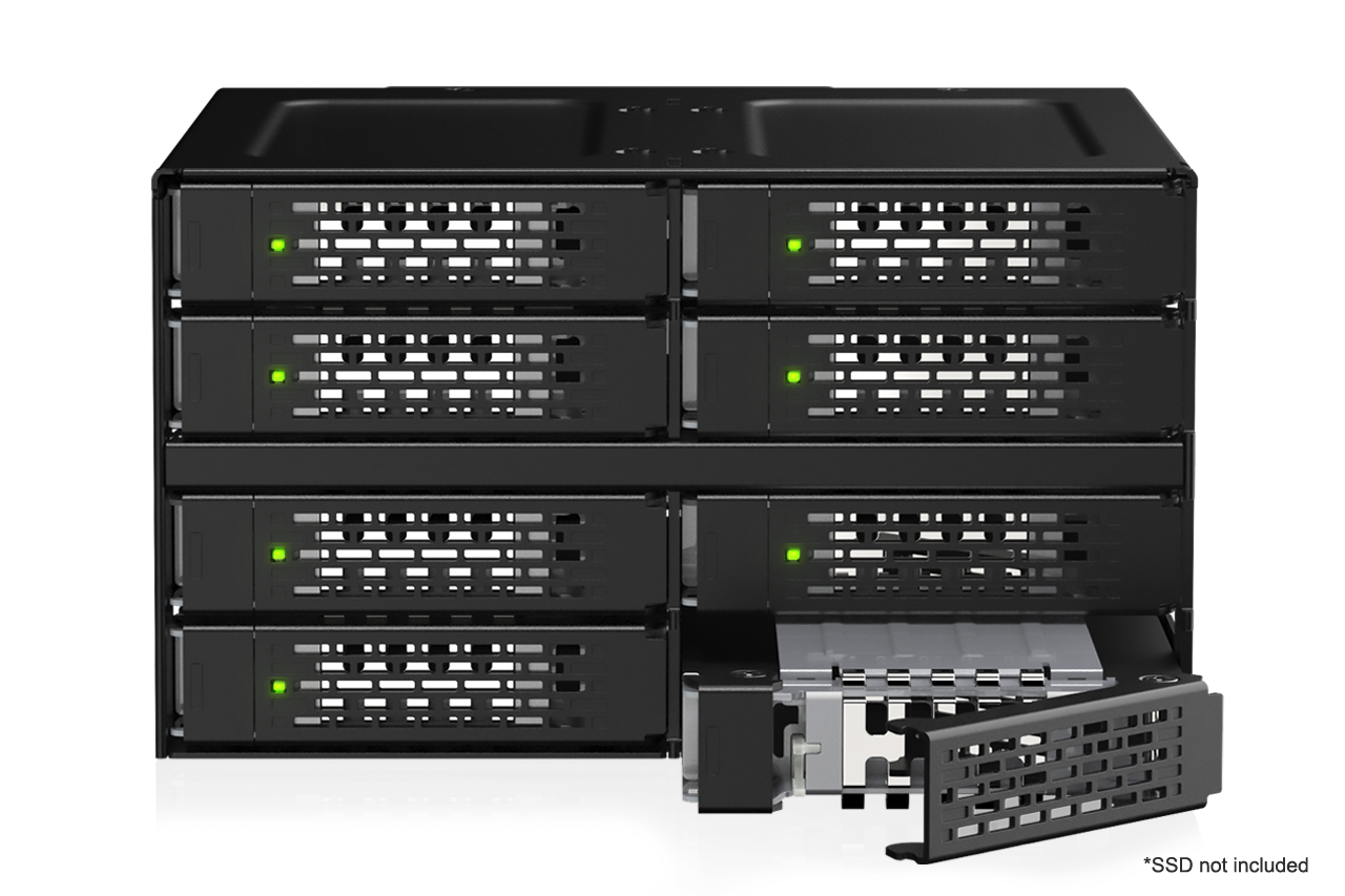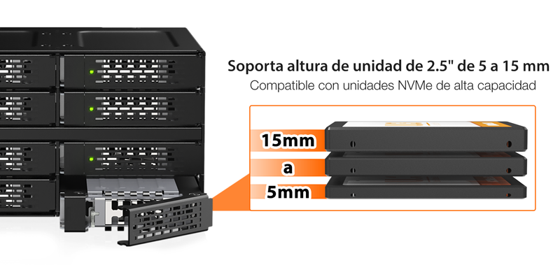 | • | Compatible con SSDs U.2/U.3 de 7 mm a 15 mm de altura (preparado para futuros estándares de 5 mm y 9.5 mm) |