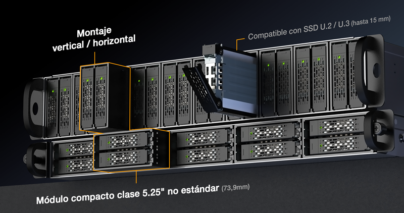 El CP164 está diseñado con un formato compacto de clase 5.25" no estándar, brindando a los constructores de sistemas una mayor flexibilidad al diseñar configuraciones de montaje en bastidor compactas o de múltiples módulos. A diferencia de las jaulas de unidades extraíbles estándar, el CP164 está destinado a una integración directa en chasis de montaje en bastidor OEM/SI, lo que permite:
