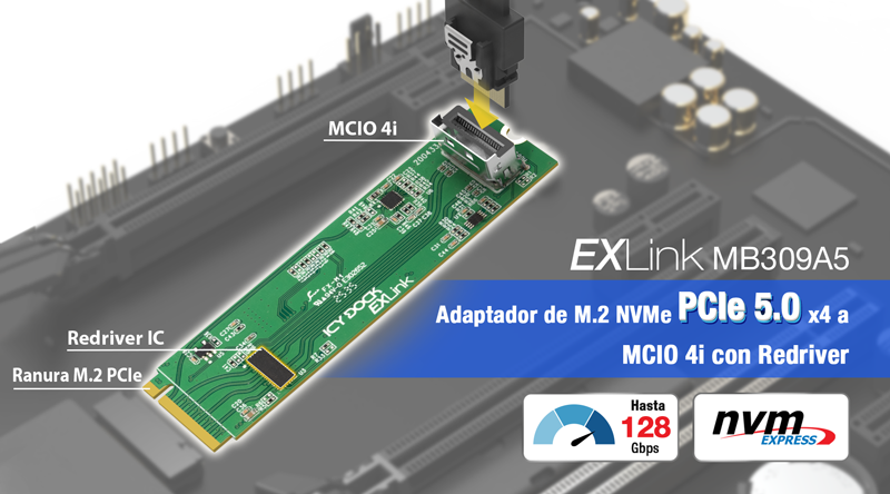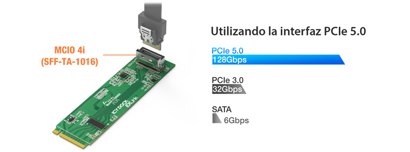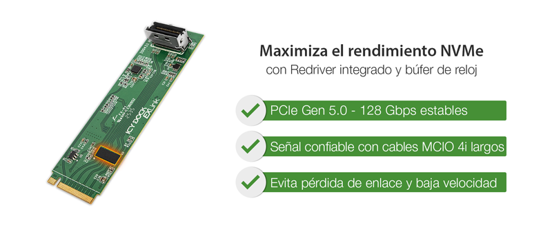 | • | Convierte una ranura NVMe M.2 (PCIe Gen5 x4) en una salida MCIO 4i |