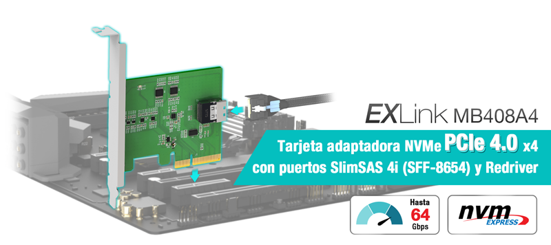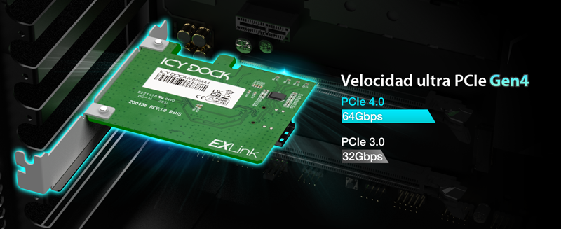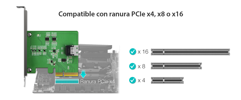 | • | Compatible con ranuras PCIe 2.0 / 3.0 / 4.0 / 5.0 (x4 físicas) |