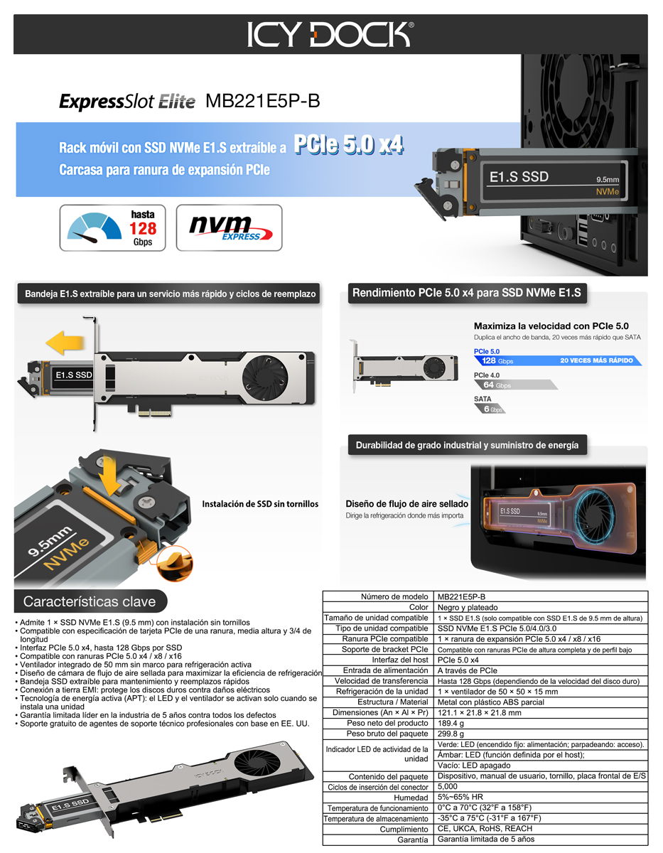 | Tipo de unidad compatible: | SSD NVMe E1.S PCIe 5.0/4.0/3.0 |