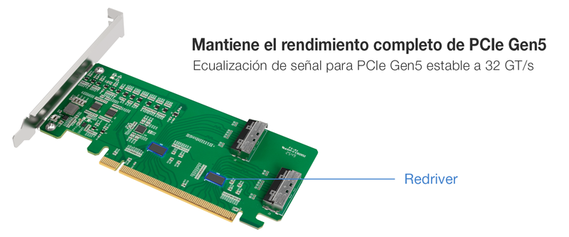 | • | Redriver PCIe Gen5 integrado para ampliar el alcance de las pistas y los cables (señalización de 32 GT/s) |