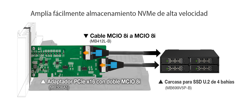 Consejo clave: La disponibilidad de carriles PCIe depende de las especificaciones de su placa base y CPU, así como de cuántos SSD PCIe y otros dispositivos tenga instalados. Por lo tanto, no podemos garantizar la compatibilidad con el MB308A5 basándonos únicamente en una lista de compatibilidad. Recomendamos encarecidamente consultar con el proveedor de su placa base para confirmar cuántos carriles PCIe están disponibles en su sistema y si las ranuras PCIe vacías restantes pueden admitir completamente el MB308A5 con cuatro SSD NVMe.