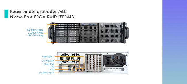 El Grabador MLE NVMe FFRAID es un sistema de alta velocidad basado en FPGA diseñado para grabación sin pérdida y sin interrupciones a 100, 200 o 400 Gbps. Impulsado por la tecnología propietaria NVMe Fast FPGA RAID (FFRAID) de MLE, ofrece procesamiento en tiempo real y almacenamiento NVMe de alto rendimiento. El sistema admite hasta 18 x U.2/U.3 NVMe SSDs con cada canal respaldado por un motor RAID dedicado y una ruta de almacenamiento, garantizando un rendimiento consistente y determinista. Múltiples unidades pueden encadenarse mediante sincronización de tiempo IEEE para ampliar el ancho de banda y/o la duración de la grabación.