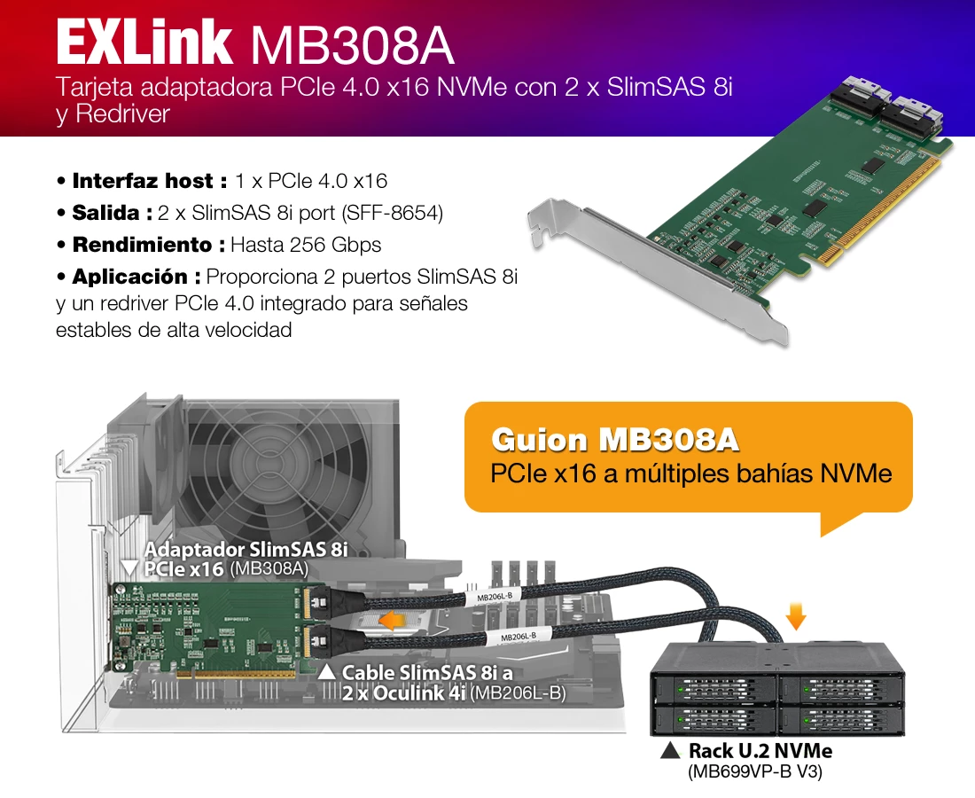 Con el EXLink MB308A, una ranura PCIe x16 (compatible con la bifurcación de la placa base) se puede dividir en varios enlaces NVMe x4, lo que permite configuraciones NVMe extraíbles de alta densidad.
